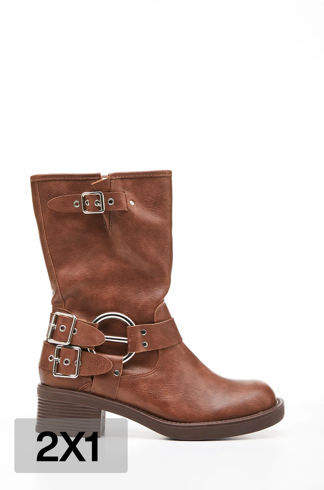 Botas de ecocuero de caña baja, con base de 1,5 cm , taco de 2,5 cm y caña de 21 cm de alto. Circunferencia de la caña 38 cm. Industria Argentina.