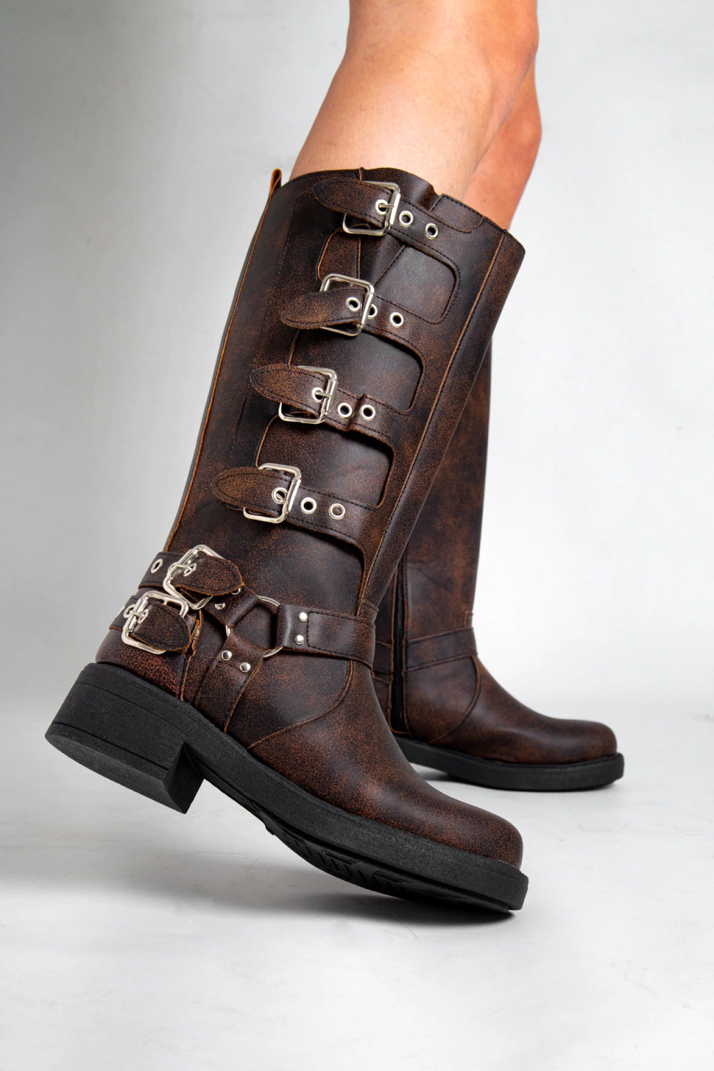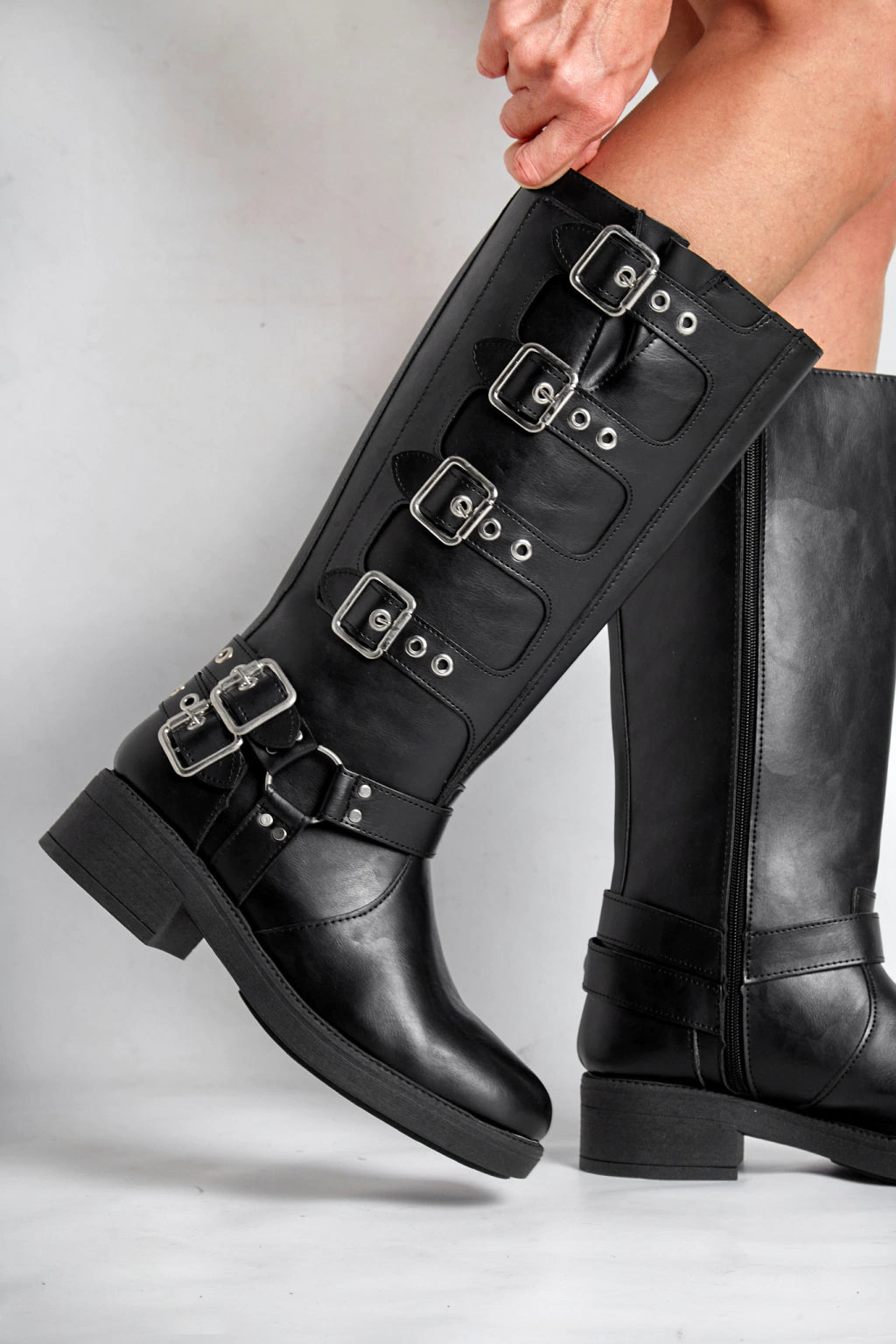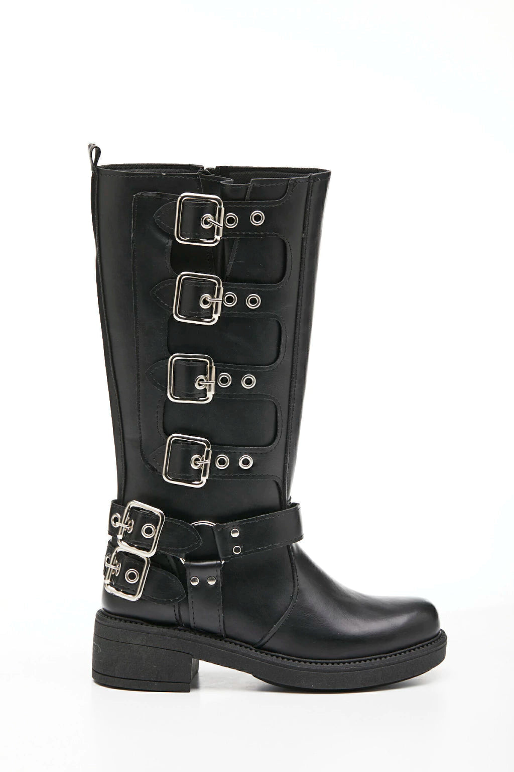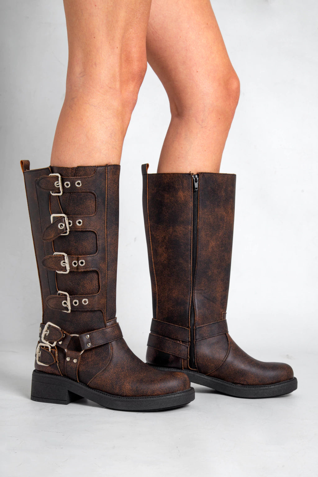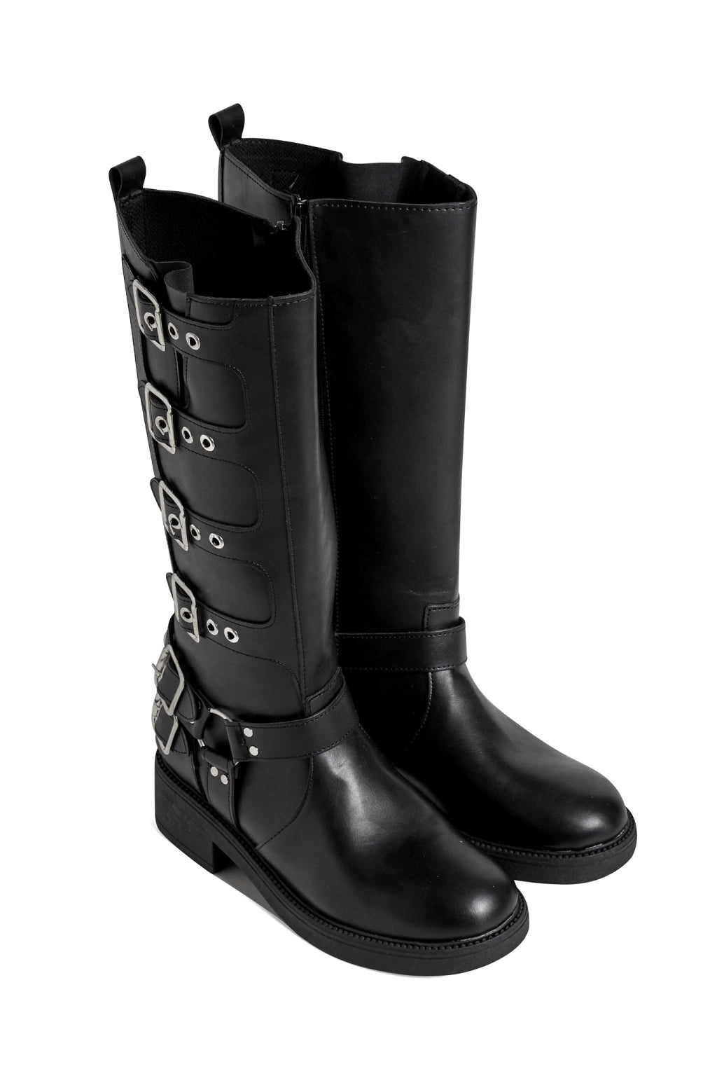 Borcegos de ecocuero, con hebillas en los costados y cierre. Altura de caña 33,5 cm, alto de base 5 cm. Industria Argentina.