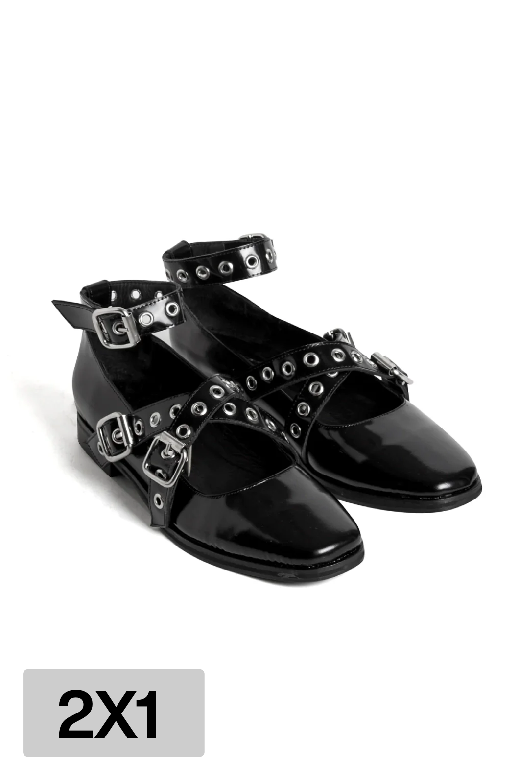 Chatas de cuero con tiras cruzadas y tachas. Industria Argentina.