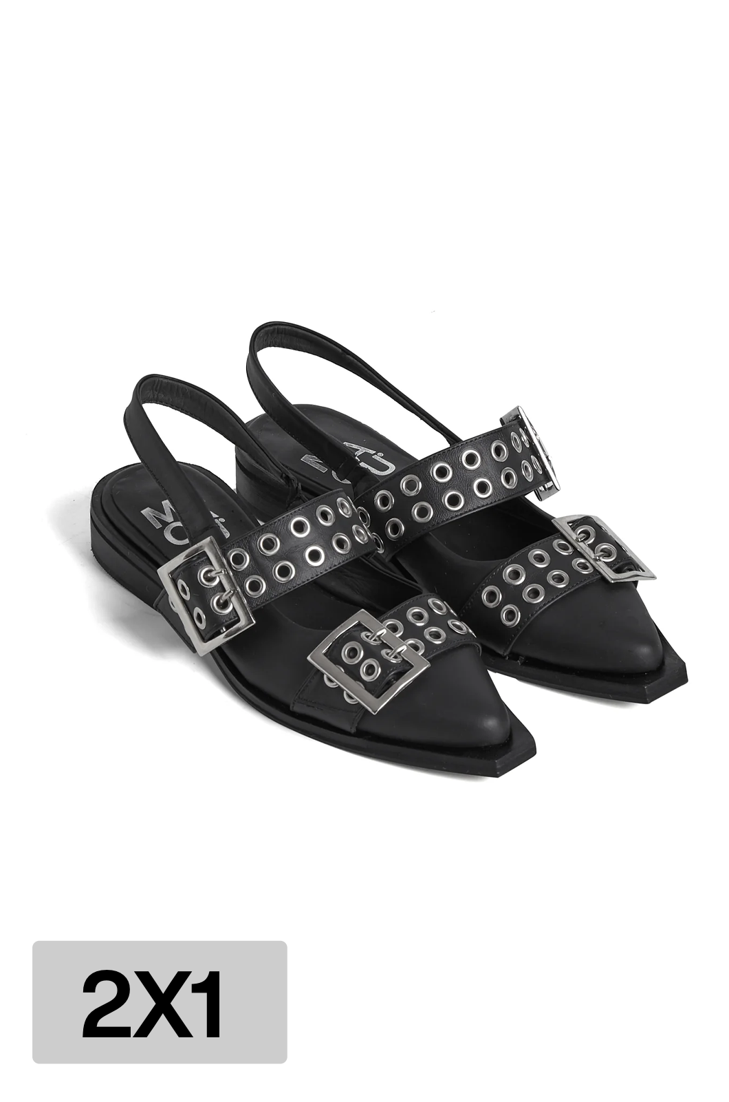Chatas en punta de cuero, con hebillas color plata. Industria Argentina.
